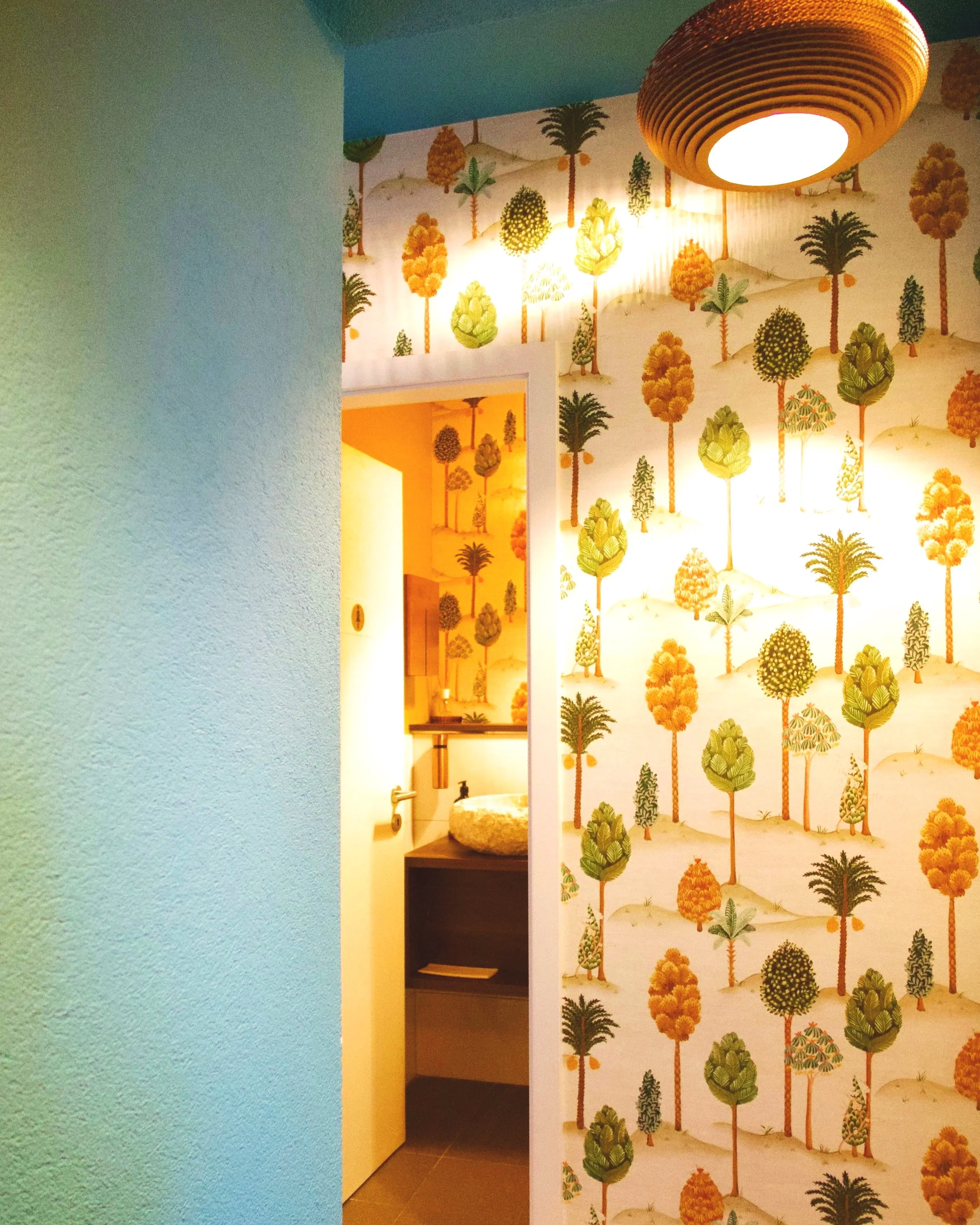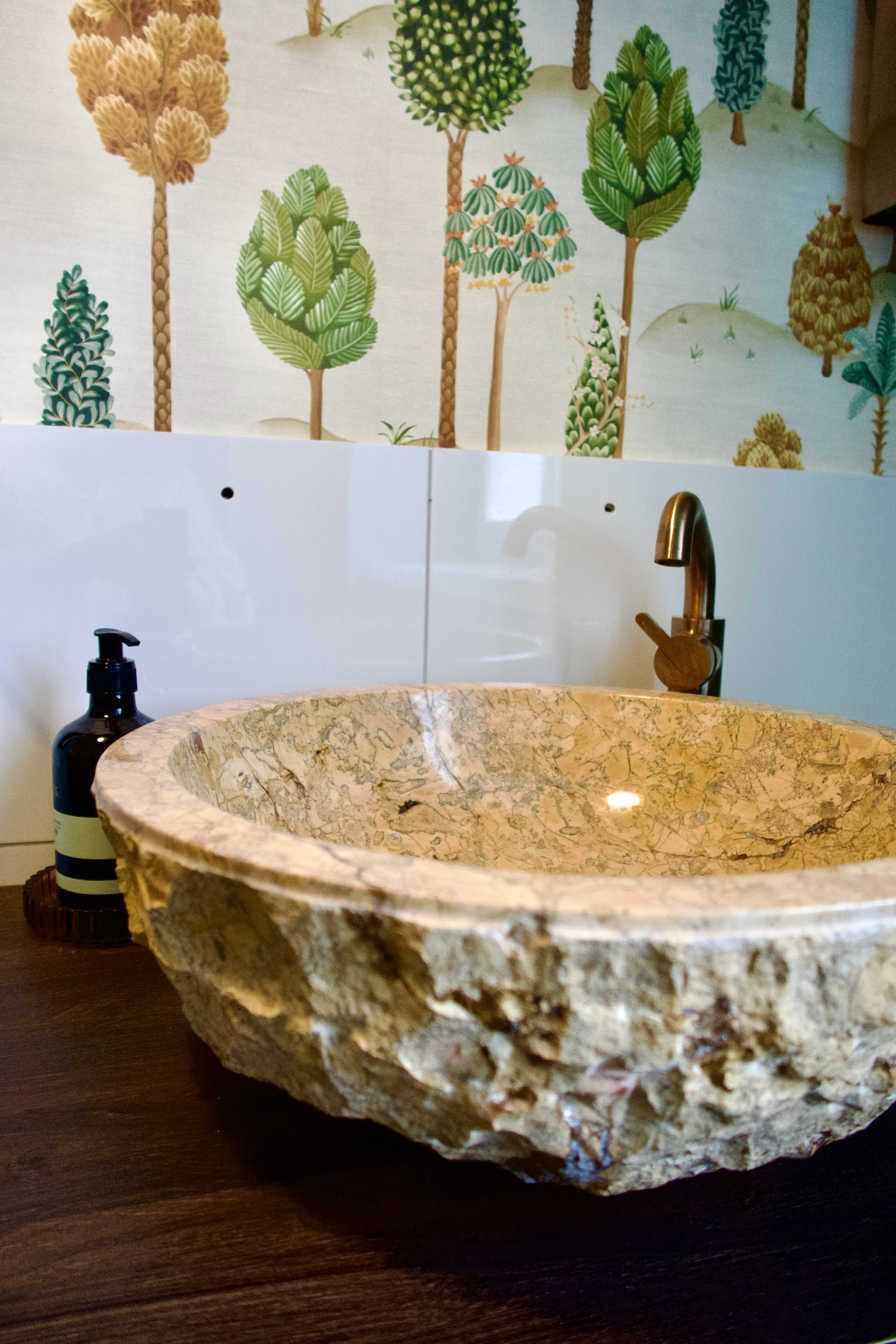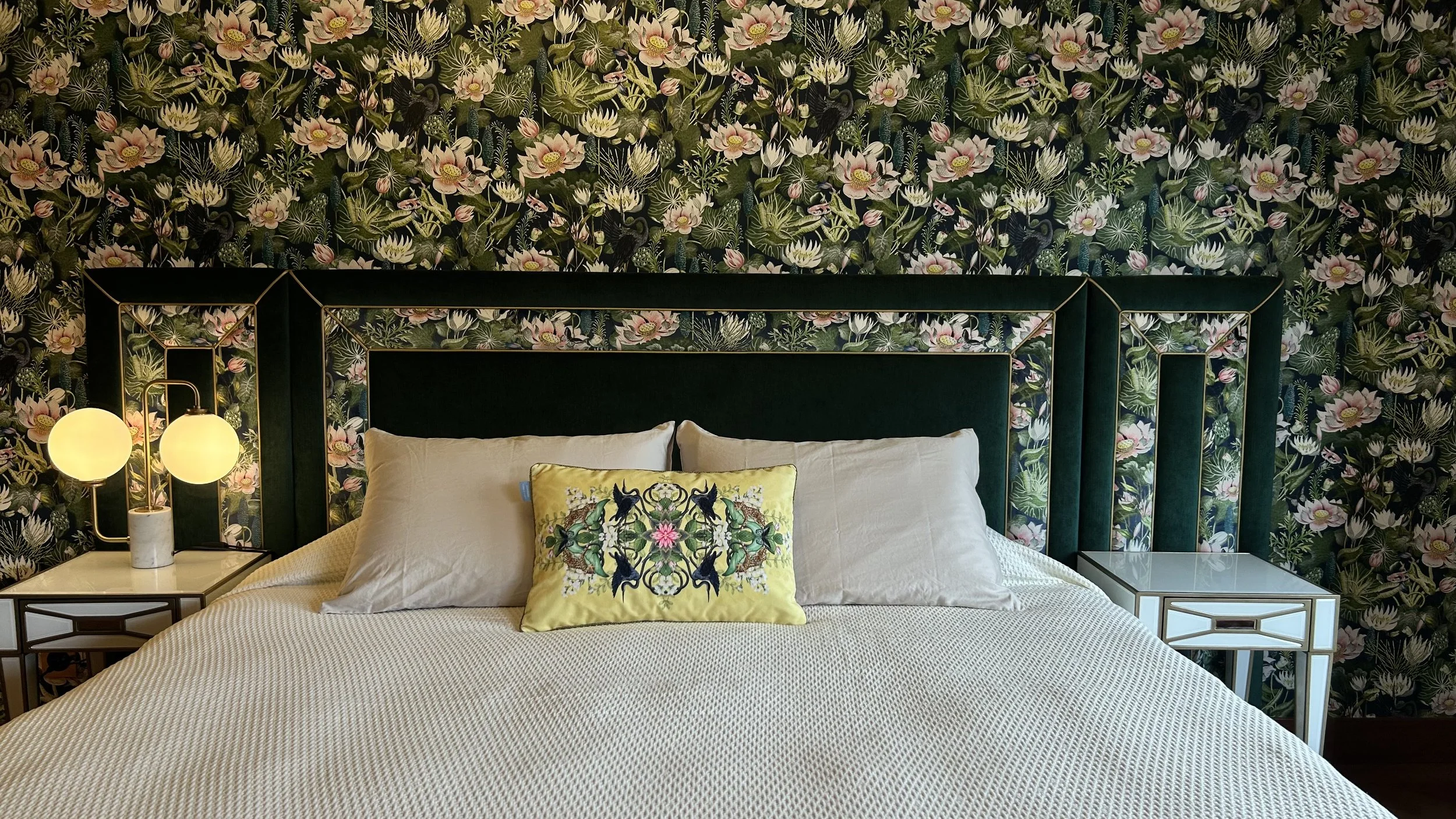Custom joinery, textile wall coverings by Osborne & Little, and expressive finishes create a space that is both vibrant and grounded. Materials are selected for their tactile quality, balancing bold pattern with refined detailing.