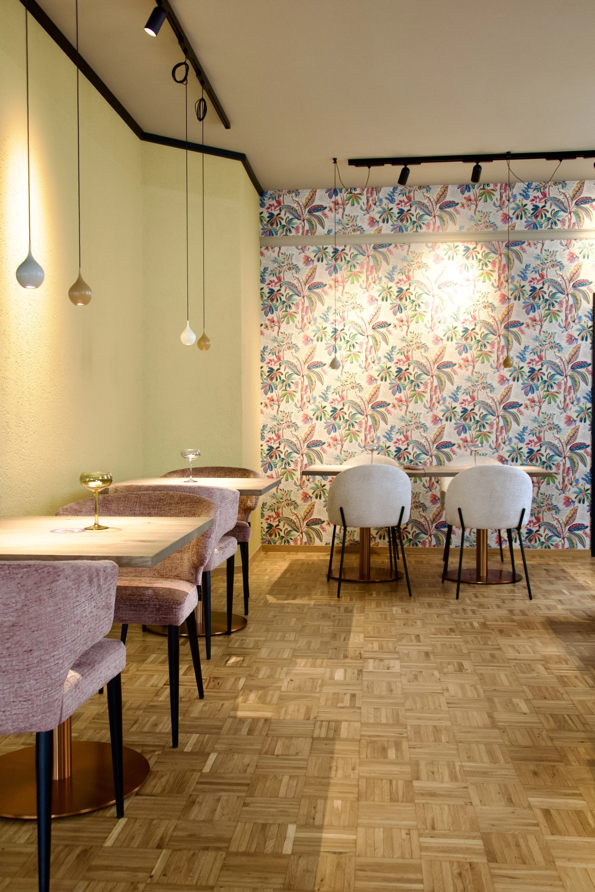 A richly layered dining interior defined by colour, texture, and material contrast.